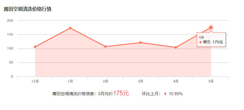 莆田清洗空調(diào)的收費標(biāo)準(zhǔn)一般在60-300元不等,由于空調(diào)的型號和規(guī)格不同,收費標(biāo)準(zhǔn)也有所不同,因此具體的費用要師傅根據(jù)具體情況報價!下面為莆田近幾個月的空調(diào)的費用波動圖,僅供參考:
