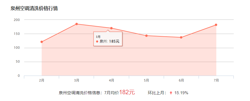 泉州空調(diào)清洗收費(fèi)標(biāo)準(zhǔn):掛機(jī)60元起,柜機(jī)80元起,天花機(jī)100元起,中央空調(diào)40元/風(fēng)口起,具體費(fèi)用與空調(diào)的規(guī)格和清洗難度有關(guān),要了解具體價(jià)格可來(lái)電咨詢!下面為泉州近幾個(gè)月空調(diào)清洗的費(fèi)用波動(dòng)圖,僅供參考: