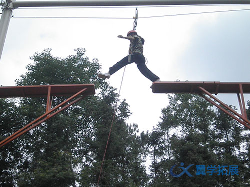 2、斷橋項目:參訓(xùn)隊員爬越9米高的斷橋立柱,站立于斷橋橋面之上,兩臂自然平伸,保持身體平衡,移步至橋面一側(cè)邊緣,以后腳的蹬力,使身體向前躍出,跨過斷橋落于橋面另一測,平穩(wěn)走到終點。項目目的:成功與失敗永遠(yuǎn)只差關(guān)建的一步,勇敢的跨出這一步,成功就屬于你??朔o張情緒、戰(zhàn)勝恐懼心理、果敢的執(zhí)行力借助外勢、建立突破自我、挑戰(zhàn)困難的自信心與勇氣。