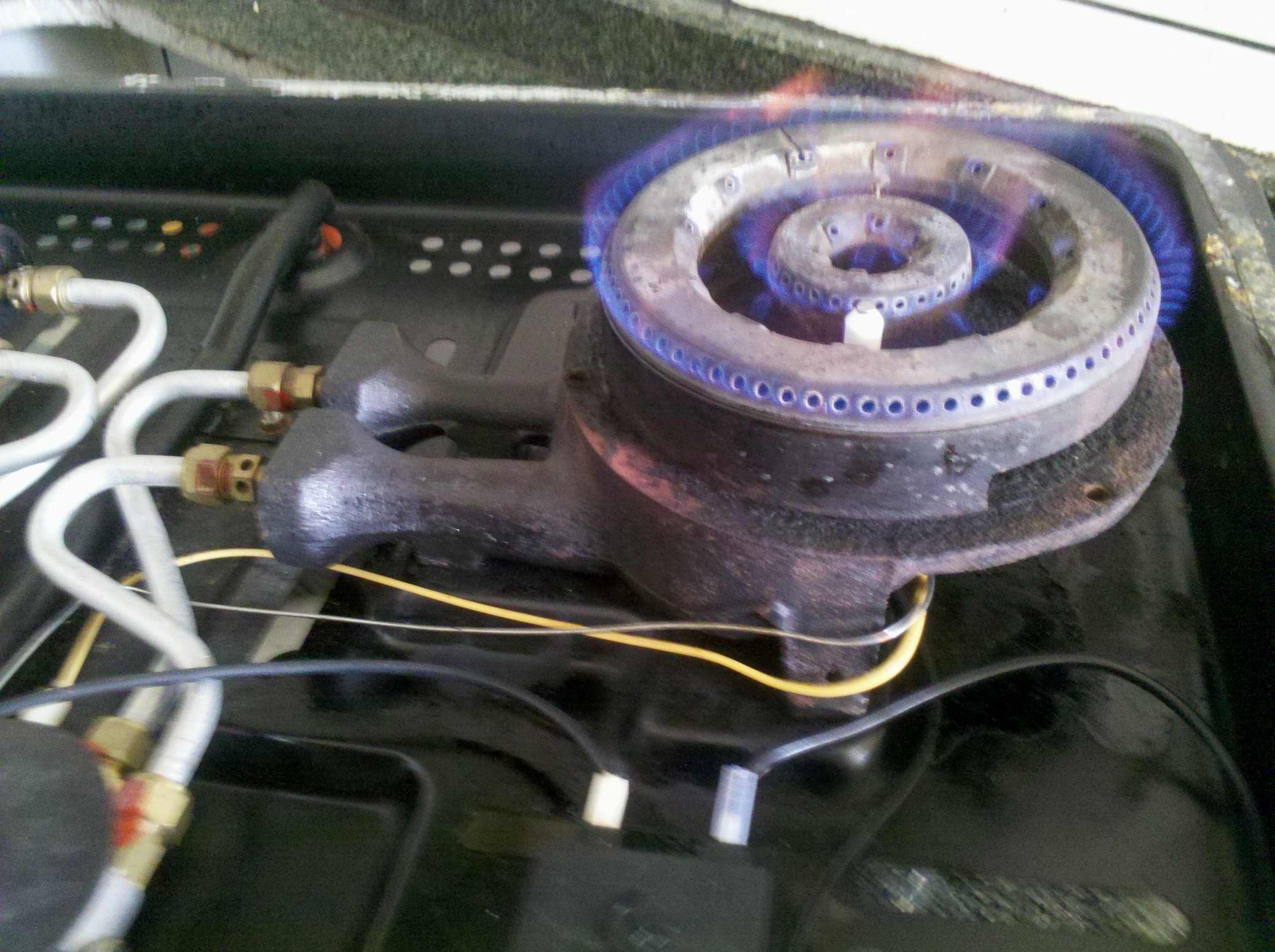 焚燒器火蓋火孔被污物阻塞,阻止焚燒器混合氣體流出,整理火孔污物;噴嘴阻塞,擰下噴咀整理潔凈;調(diào)壓器進氣口和噴嘴被鐵銹阻塞,阻止瓶體內(nèi)燃氣流出,替換合格的調(diào)壓器;膠管折扁通氣受阻,理直膠管。