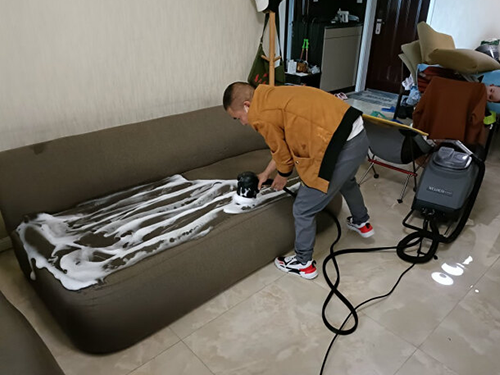 二、用專業(yè)的沙發(fā)清洗機(jī)注入高泡地毯水進(jìn)行全面的刷洗,一到兩遍。