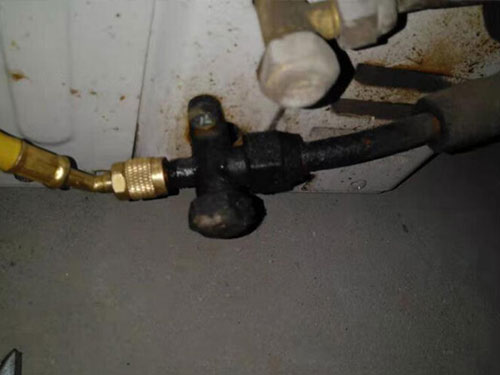 1.將空調(diào)開啟運轉(zhuǎn),制冷模式(冬季無法開啟制冷,可將感溫器放在熱水中),加氟管連接外機接口(有兩根銅管,加液需要接粗管的接口,如下圖)。