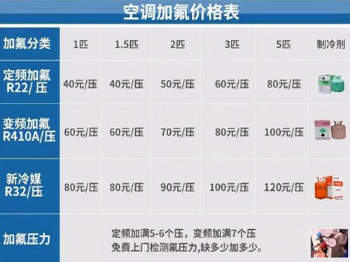 空調(diào)加雪種收費(fèi)標(biāo)準(zhǔn):按壓力:45元起/壓力,具體加幾個(gè)壓力以師傅上門用儀器檢測為準(zhǔn)。按臺:90元起/臺,具體根據(jù)不同空調(diào)匹數(shù)報(bào)價(jià)?照{(diào)加氨本月優(yōu)惠中,歡迎來電咨詢!