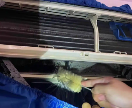 清洗空調(diào)冷凝器:用高壓水槍沖洗冷凝器表面,再用刷子清理散熱片。