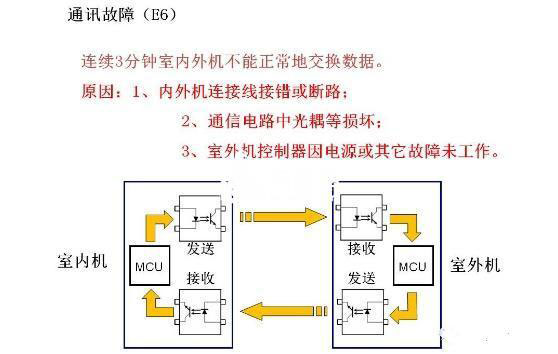 當格力變頻空調連續(xù)3分鐘室內外機不能正常地交換數據就會出現故障代碼e6,出現e6的原因有3個,一是室內外連接線接錯或斷路,二是通信電路中光耦等損壞,三是室內外控制器因電源或其他故障未工作。
